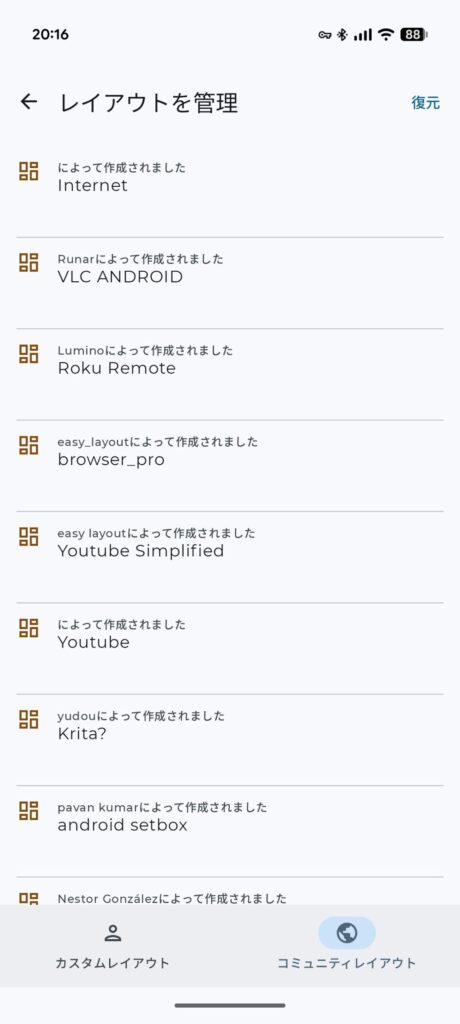 以下のレイアウトは左上の【三】をタップ➡【カスタムレイアウト】にある【レイアウトを管理】➡【コミュニティレイアウト】の登録されている中から、お好みのレイアウトを選択することができます。
