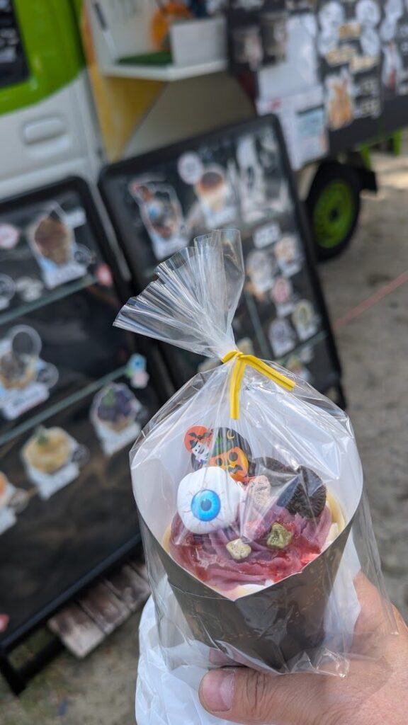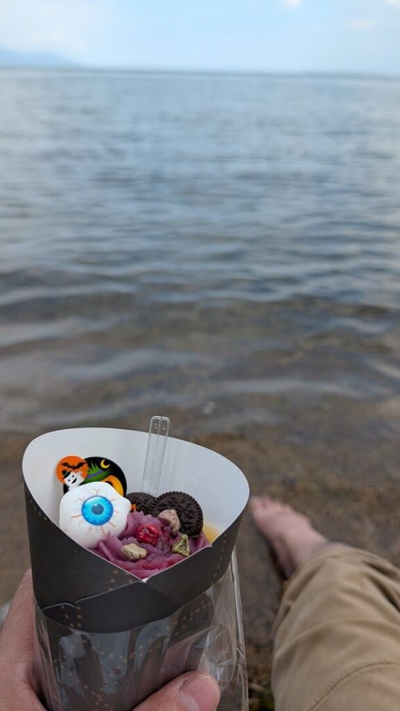 せっかくなので、琵琶湖のレイクサイドでハロウィンにちなんだ(ちょっとグロい)クレープを美味しくいただきました。