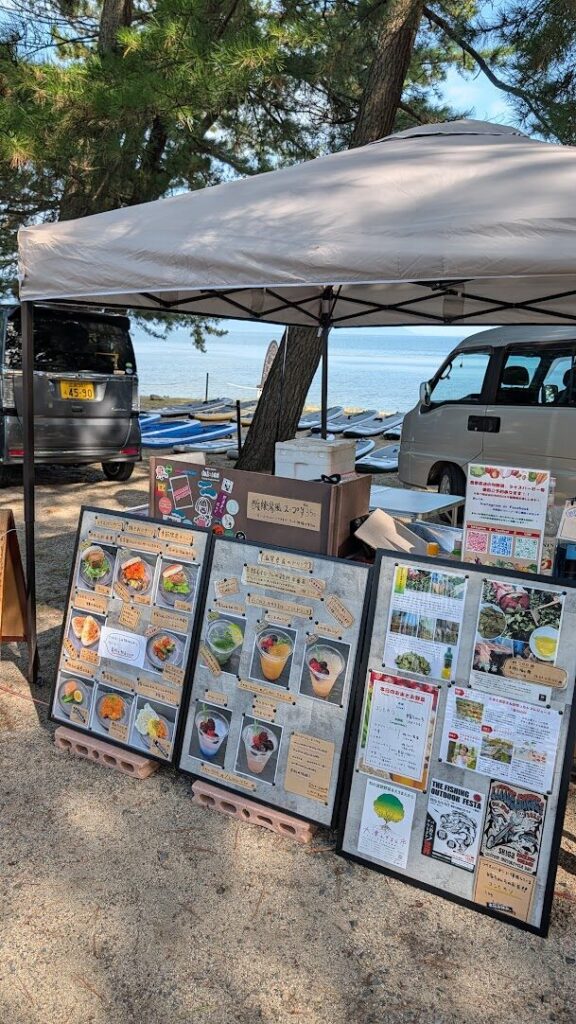 音に誘われて歩いてみると、そこはイベントの準備会場。なんとその日は、琵琶湖のほとりで満月の時に開催される「満月マルシェ」の当日だったのです。