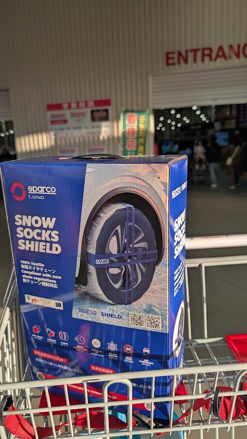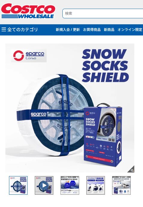 私は以前からコストコ会員でしたので、この機会に布製スノーチェーンのSPARCO「Snow Socks Shield」を購入しておきました。