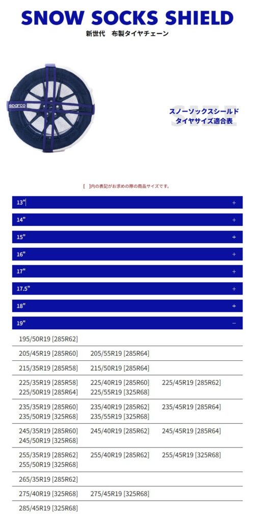 シーライオン7も布製タイヤチェーンの車種別適合表に記載されていますね。見切れてしまっていますが右側に布製タイヤチェーンのサイズが記載されています。