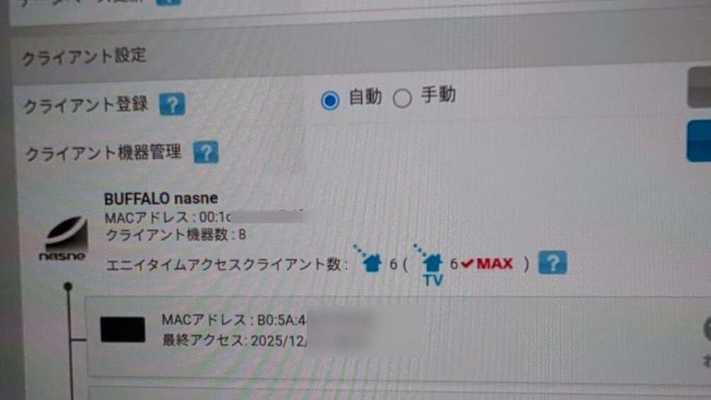 使用していないクライアント機器を削除して【エニタイムアクセスクライアント数】に空きができると改めてnasneとペアリングできるようになります。