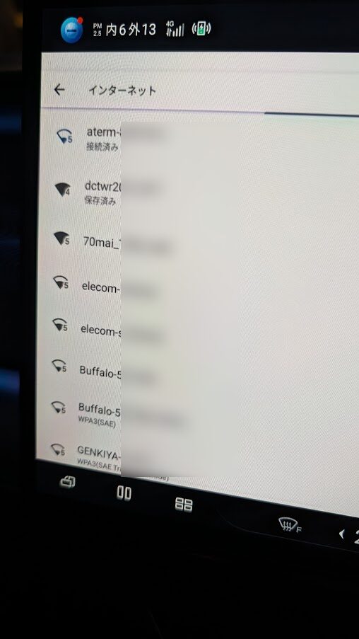 私の場合は車載ルーターの「dcwr…」から自宅WiFiルーターのNEC製の「aterm…」のWiFiに無線LANを切替ました。