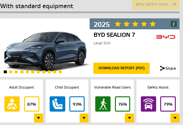 BYD SEALION 7の安全性能は、第三者機関である EURO NCAP において最高評価の5つ星を獲得しています。