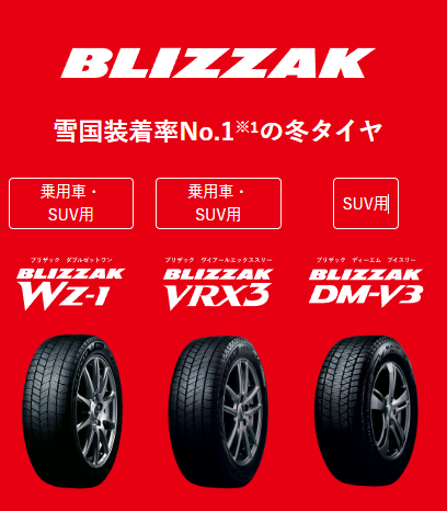 • ① 降雪地域(氷上の安全最優先)なら:【ブリヂストン BLIZZAK DM-V3】