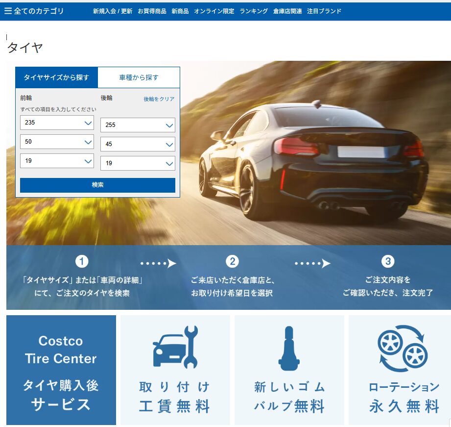コストコのオンラインストアでタイヤサイズを検索してみても良いでしょう。