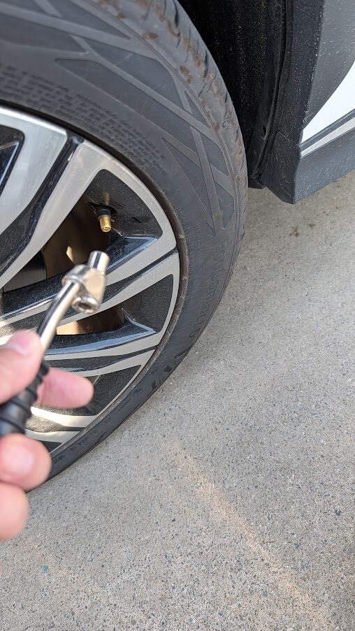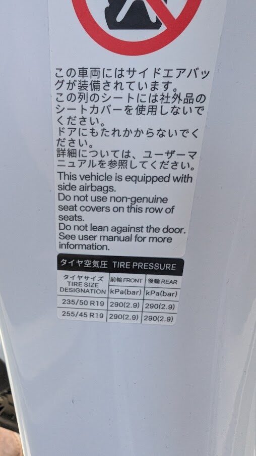 そんなことすらも良く知らない私は、そもそもタイヤの空気圧がどのくらいが適正なのかもわかってませんでしたので、SEALION7の運転席ドアの内側に貼られていた空気圧表示シールをもとにタイヤに空気を入れてみることにしました。